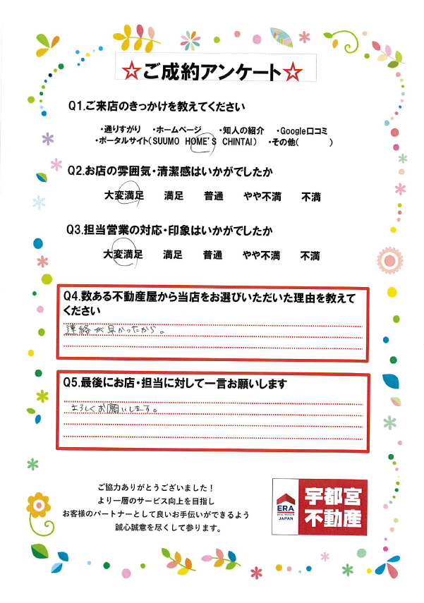 この度は、宇都宮不動産東店をご利用いただき誠にありがとうございました。